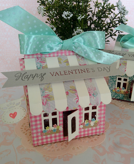 I wanted to share my cute little Valentine's Day village before the day of love comes and goes. I worked on these a few weeks ago and they have been sitting out on my sofa table enhancing my decor. They are, however, filled with strawberries and cream Lindt balls and are headed out tomorrow to be given away! I just love all of the possibilities using the "Tiny Town" dies! I think my favorite is the sweet shoppe, like I have showcased here. Each little shop was adhered to a doily for something to "ground" it as well as a little valentine charm!