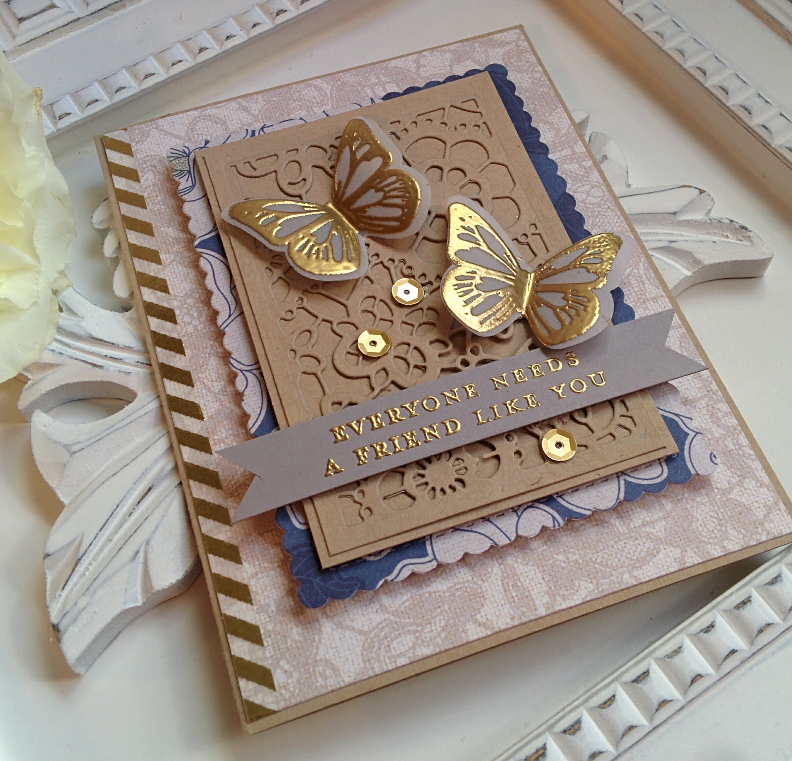 The butterfly image was die cut using vellum and then heat embossed using gold powder. I contemplated layering them onto some die cut butterflies using the same lace background paper, but finally opted for the lighter, less fussy simplicity of just the vellum butterflies. The fabulous sentiment is from the newer Keep It Simple: Friendship stamp set from Papertrey Ink. I really love it and I can see me reaching for it often.
