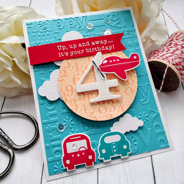 My next set of cards I made was this design. I actually ended up by making a few with the number 3 and then this one with the number 4. I used the retired Little Hot Rod set ( you can still by the dies HERE) for this design and another set further down in the post. I shamefully have only used this set a handful of times. I bought it specifically for THIS project and have only used it once since! I was so happy to pull it out for these fun birthday cards!