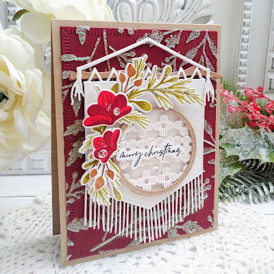It's a little bit hard to see in the photos, but I used the Berry Branch Stencil that was released last year to create a tone on tone background on the Scarlet panel! It's such a simple detail, but adds that "little something extra"! I used A LOT of Rustic White Cardstock for this release. I really like the look and feel it gives to the "fiber" elements that are part of this release, such as the Macrame dies (projects below) and the fringe and tassels on the Boho Banner. It has flecks of color throughout, just like natural macrame yarn/thread. I die cut the branch piece twice from Kraft cardstock and then glued them together using liquid glue. I wrapped the top triangle portion around the branch and secured it with liquid glue around the front and back of the main banner piece. Once that was done, I added the "tassel/string" piece using liquid glue at the knots of the tassel.