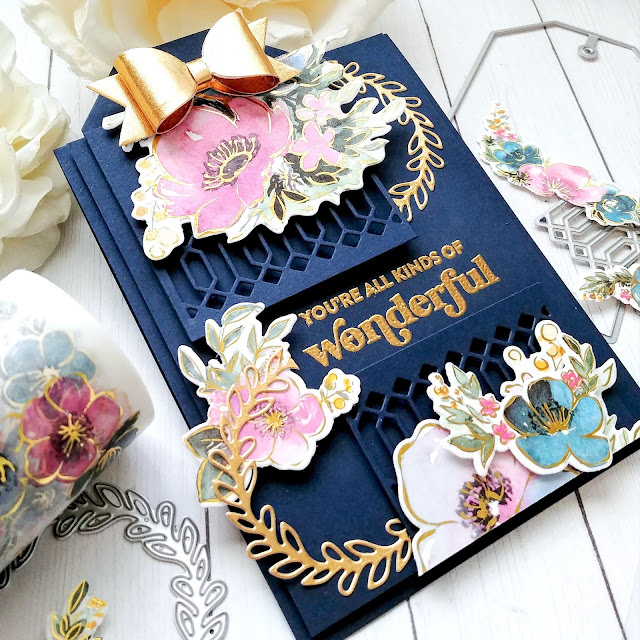 I was super inspired by Lea Lawson's card she made earlier using the Indigo Vines tape where she added the gold details with the Leafy Circle die, so that is what inspired that fun detail! I added the die cut Anemone embellishments using foam squares for a lot of dimension! As I mentioned earlier, I went ahead and added one of the tops of the tags and tucked it behind the panel with adhesive. This gave me the perfect opportunity to add a gold bow at the top of the tag portion for a little extra touch!