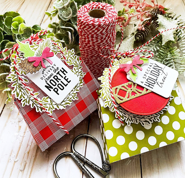 My third project using the Holiday Cheer tags is a pair of treat boxes. I really wanted to use the "A Special Holiday Treat" sentiment from the new Holiday Tags set, and I thought the cute Wreath Favor Box Die would be the perfect thing! I couldn't resist making another one using my favorite new sentiment! ha ha!