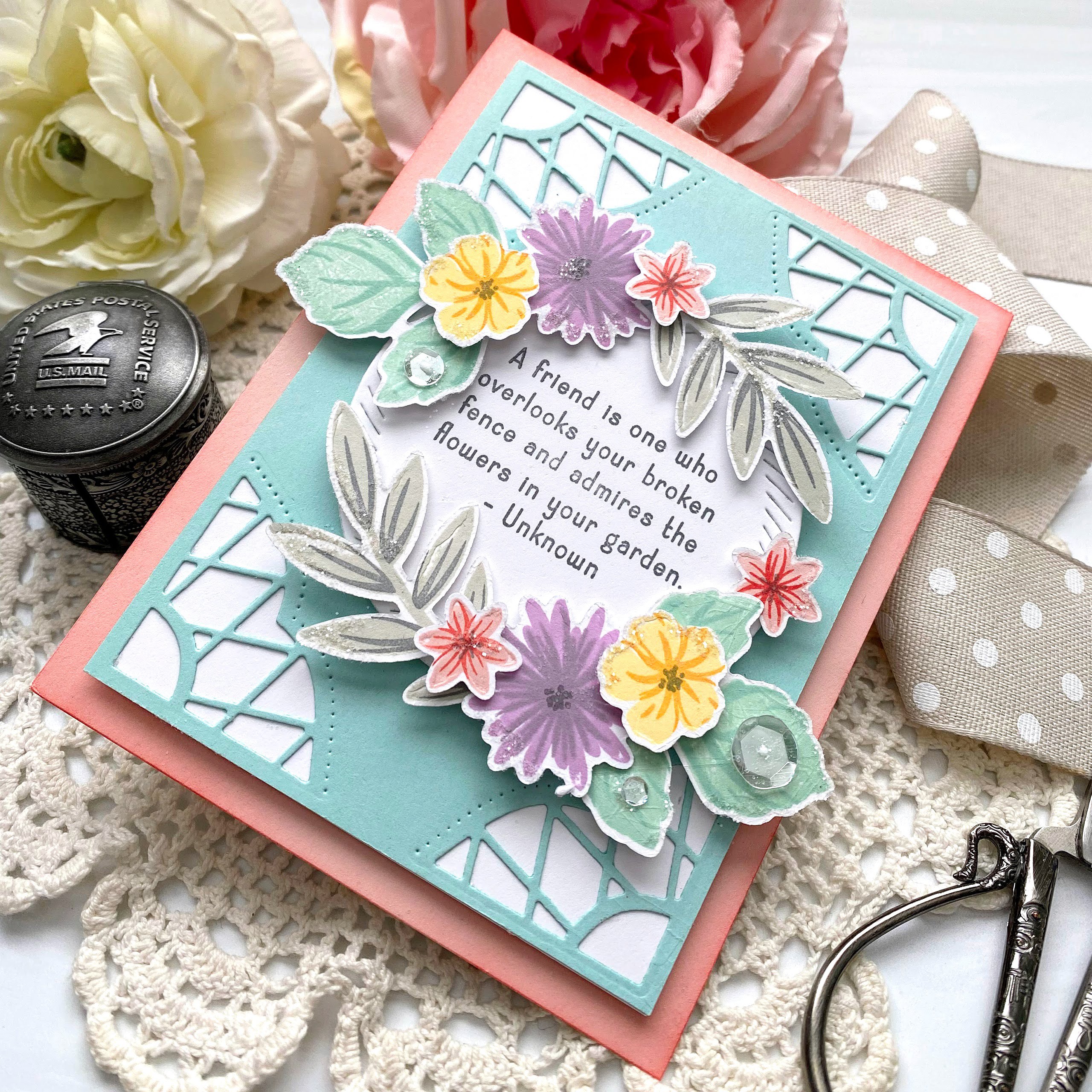 I die cut the flowers and leaves using a selection from the Into the Blooms II dies and colored them with Distress Oxide inks. I arranged them around the fence and then added the bird perched on upper flower.
