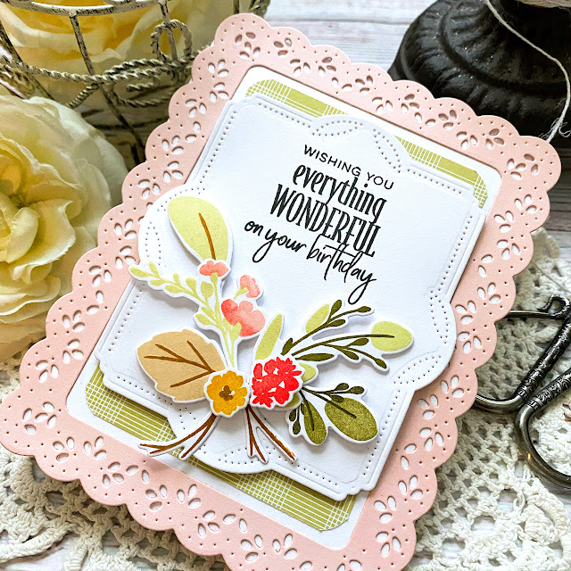 I don't think I will ever grow tired of the Border Bling: Scalloped Frame die; It accents these beautiful florals so nicely. I also added a hint of pattern by adding some Bitty Big: Spring Moss patterned paper behind the focal panel.