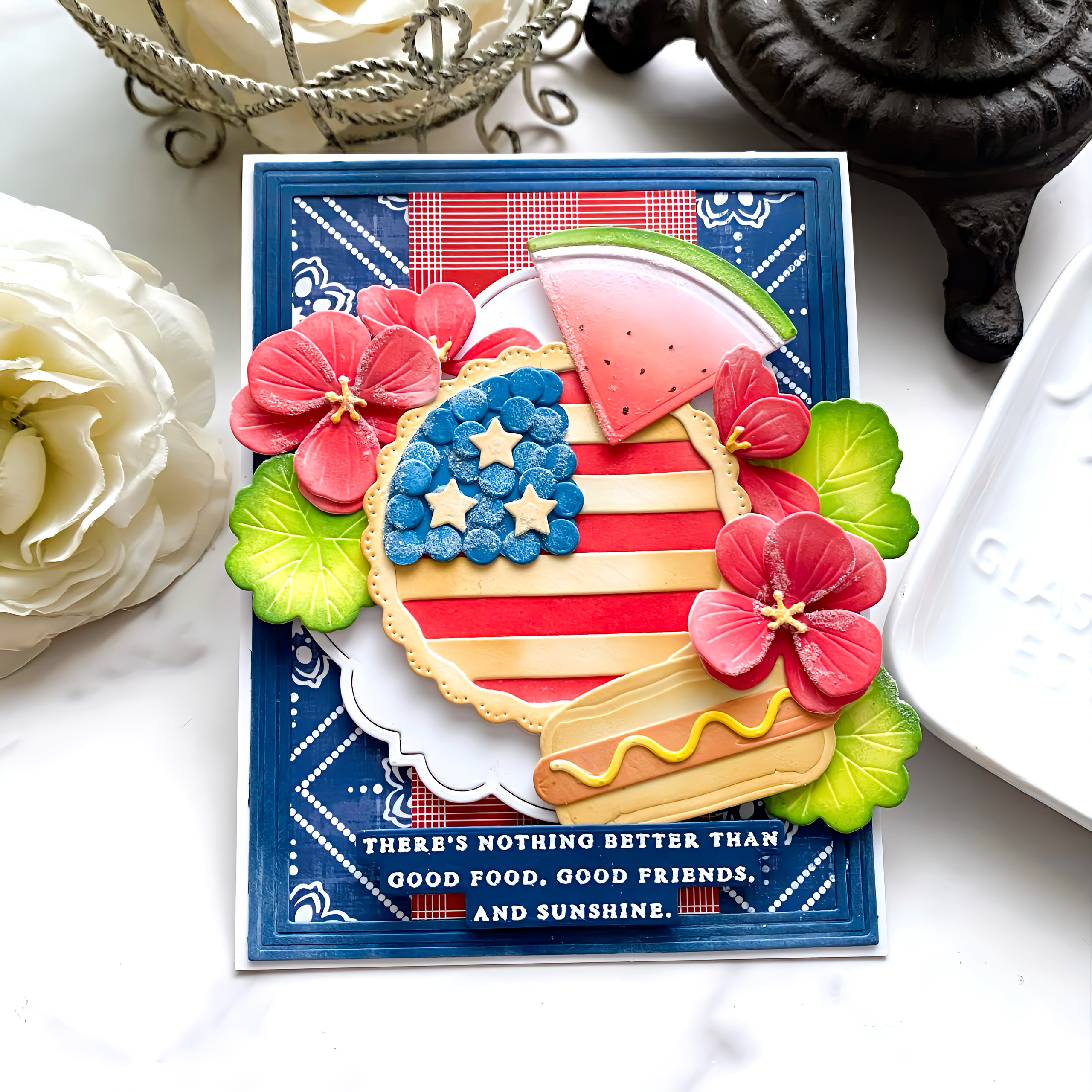 I had fun making a coordinating card using the same Bright Future stamp/die set. To begin, I used the Delicate Circles Hot Foil Plate and gold foil on a panel of Enchanted Evening cardstock. I heat embossed another sentiment and layered it onto some Pure Poppy cardstock using foam squares, but first, I coiled some metallic gold DMC floss and sandwiched it between the two layers. I wanted to add some additional texture and the foiled pattern gave me the idea to use the thread.