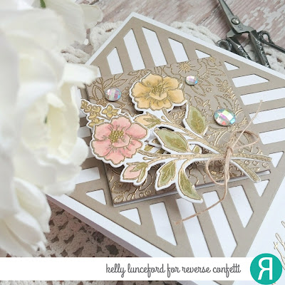 To begin, I stamped and heat embossed two of the floral images from the Tall Blooms stamp set. After they were heat set, I colored them using some Copic markers in soft colors. I really like how the Copic coloring looks paired with the gold embossing. You can see another card from the recent release using this same technique and a very similar feel HERE.