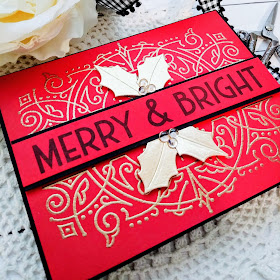 The background is embossed in gold and the sentiment is stamped in black and then layered onto a black strip to give it some definition.